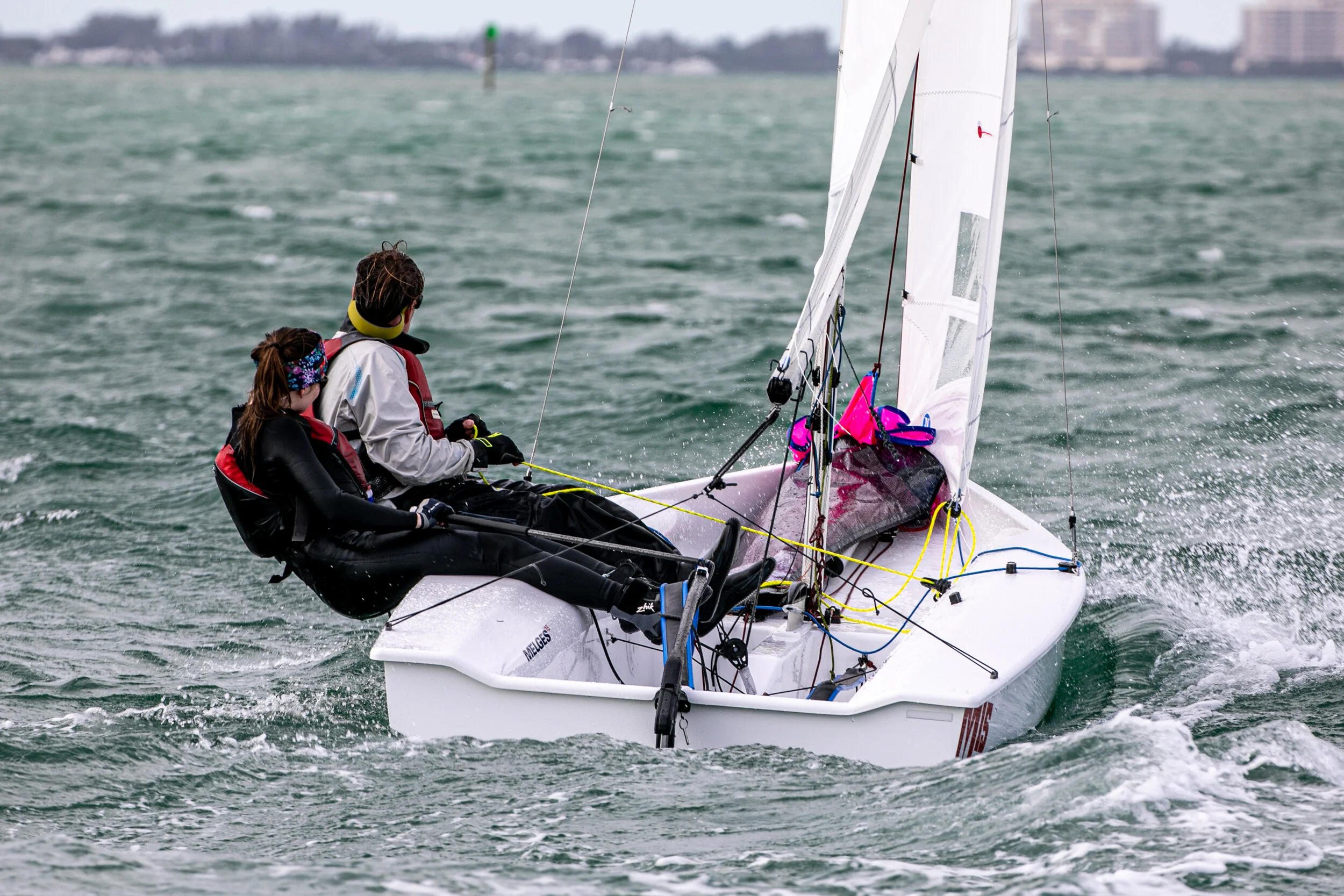 Racing kicked off on Saturday with chilly winds blowing up to 20 knots across Sarasota Bay. Smith/Murray were able to hold their own in the big breeze and started the day winning race one then following fellow regatta leaders Emily and John Haig and Finn and Andy Burdick.